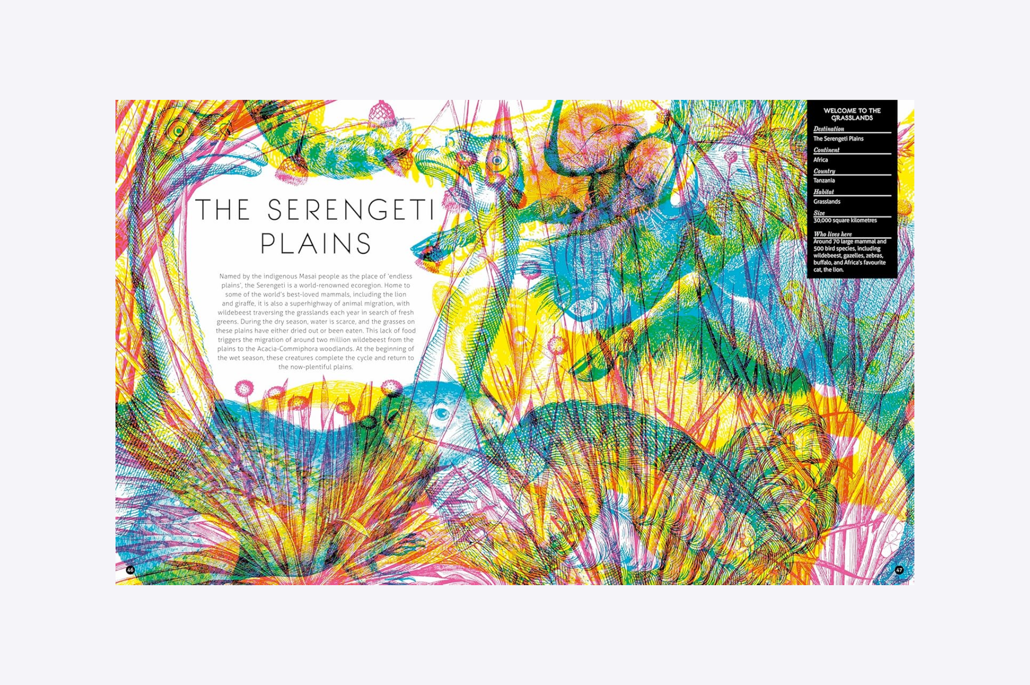 Each chapter begins with an introduction to one of six continents: Asia, Africa, Europe, North America, South America and Australasia & Oceania.   In the Nature section, your red lens reveals daytime animals, your blue lens reveals nocturnal animals, and your green lens reveals the environments they live in. In the Oceans section, your red lens reveals fish, your blue lens shows the other creatures that call each ocean home, and your green lens sheds light on underwater seascapes.